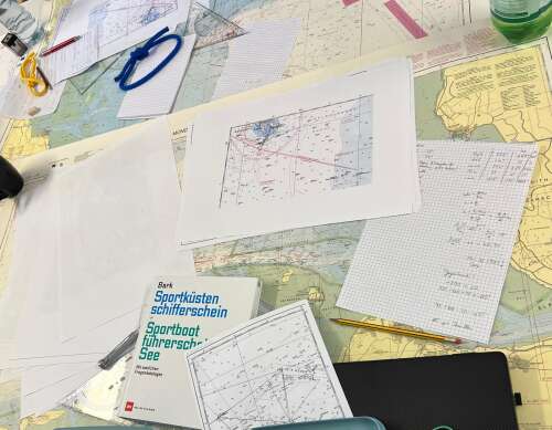 Es wird empfohlen, sich ein Navigations-Set sowie ein Kombi Buch "SKS & SBF-See" zu kaufen (z.B. Delius Klasing Verlag, Autor Axel Bark).